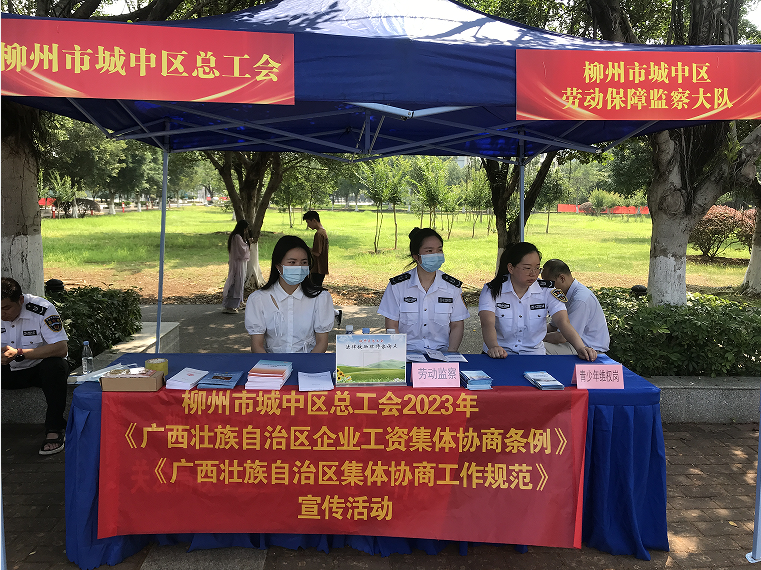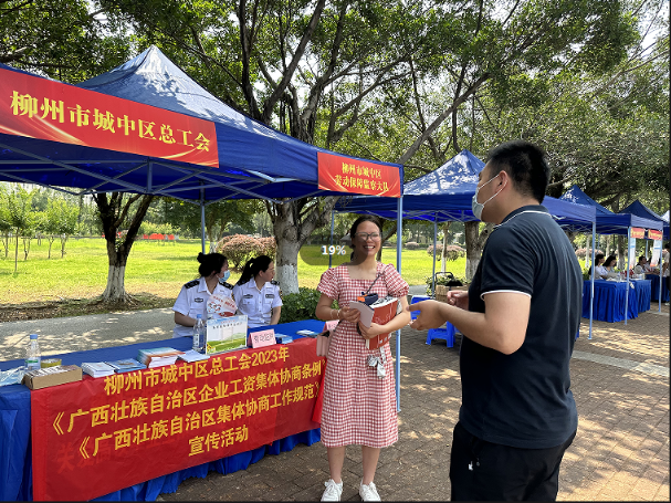 (城中区总工会讯 通讯员杨丹凤报道、韦佳华摄影)为推进柳州市城中区工资集体协商,扩大集体协商的社会影响面和覆盖面,深化共建共治共享的协商理念,5月31日,柳州市城中区总工会到柳州工学院开展“筑梦龙城‘职’引未来”城中区高校毕业生招聘会现场开展集体协商工作规范、集体协商条例宣传活动。