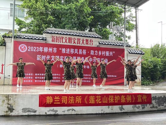 柳州市城中区柳东村位于莲花山保护片区内,村民的日常行为与莲花山片区的保护有着密切的联系,因此提高村民的生态环境保护意识成为必不可少的宣传工作重点。为进一步加大对《柳州市莲花山保护条例》知识的宣传和推广,8月14日,静兰司法所联合柳东村委会开展《柳州市莲花山保护条例》文艺演出宣传活动。