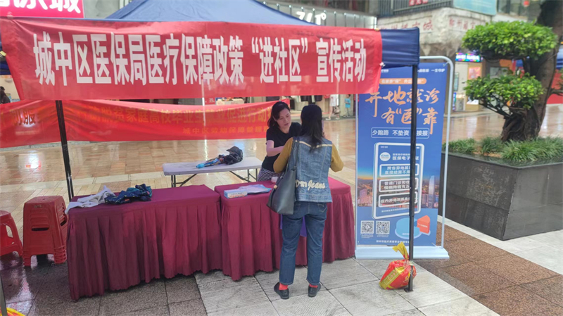 图为城中区公园街道在五星步行街开展医疗保障政策“进社区”宣传活动