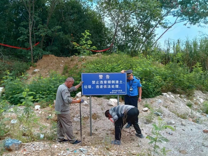 (城中区执法局讯 通讯员邓湖广报道)为进一步加强城市建筑垃圾处置管理工作,9月22日下午,城中区城管执法局在桂柳路莲花悦府 、柳东村上坭屯 、莲花山庄三处周边醒目位置,竖立起印有“禁止违章倾倒渣土、垃圾,违者依法处理”字样的警示牌。警示牌用铁皮做成,牌上标明了警示内容,并公布了监督举报电话,起到了告知、宣传和警示作用。