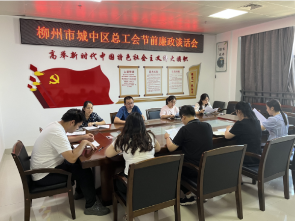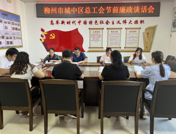 (城中区总工会讯 通讯员陈汝报道、刘星辰摄影)为进一步落实全面从严治党主体责任,严明节日期间纪律作风要求,驰而不息从严纠治“四风”,营造风清气正的良好节日氛围,9月27日下午,柳州市城中区总工会召开“中秋”“国庆”节前廉政谈话会,全体干部职工参加。