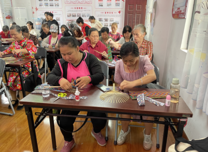 活动现场,团扇指导老师向大家介绍了团扇背后蕴含的深厚民族文化内涵及制作方法。随后,参与活动的居民们在老师的指导下开始制作团扇。在大家专注细致地制作下,一幅幅美丽的壮锦图案渐渐出现在扇面上。大家在活动中不仅能体验到平心静气打造一件工艺品的成就感,进一步接触了中华优秀传统文化,也丰富了自己的业余文化生活,增进了邻里之间的和谐关系。