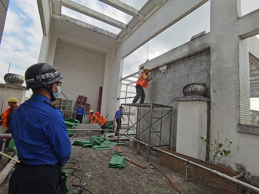 由于事先宣传工作到位,执法人员当天实施拆违行动时,违建内原有的物品已经基本搬离。切断水电后,劳务工人进场对违建施实拆除。在调查中,执法人员发现平台上还存在一间违建“杂物房”,也一并进行了查处。