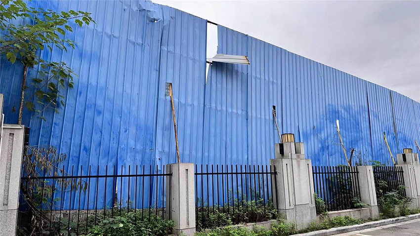 当天上午10点左右,执法人员来到现场,看到该处围挡有2米多高,其中一块围挡的顶部一片半米左右宽度的铁皮脱落,仅有一角与围挡主体相邻,吊在半空,给过往行人车辆带来安全隐患。