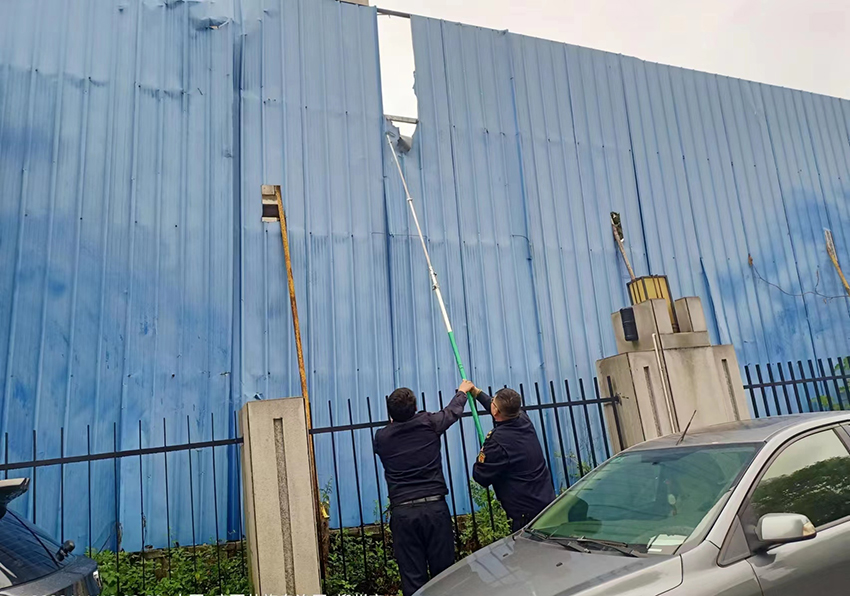 执法人员走访工地,但工地目前暂停建设,无人施工,一时间不能对围挡进行维修。为了及时消除安全隐患,执法人员决定立即对破损的围挡进行清理。随后拿来一把5米勾枪,将悬在半空的破损铁皮取下。