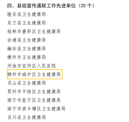 其中,柳州市城中区卫生健康局荣获“县级宣传通联工作先进单位”称号,清廉医院工作专班刘珊同志荣获“宣传通联先进个人”。