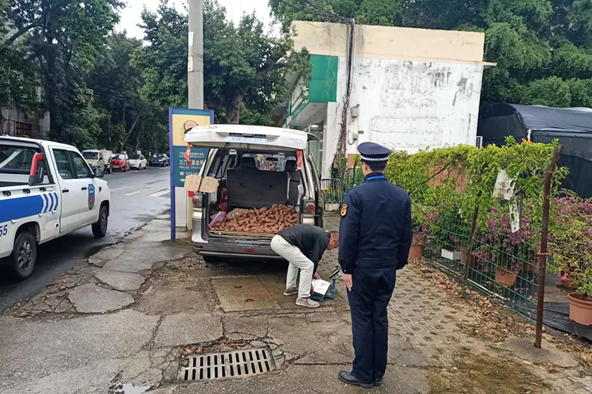 接报后,城管执法人员迅速赶到现场,看见一辆小轿车停在人行横道斑马线附近,利用打开的汽车尾门,占道摆卖。执法人员向车主解释了城市管理相关的法律规定,对他进行了批评教育,并引导他前往附近农贸市场售卖。车主接受了批评,表示以后会遵守城市管理规定,并立即收拾好物品离开了现场。此外,不远人行道上也有一辆面包车在占道卖红薯,也被执法人员教育劝离。