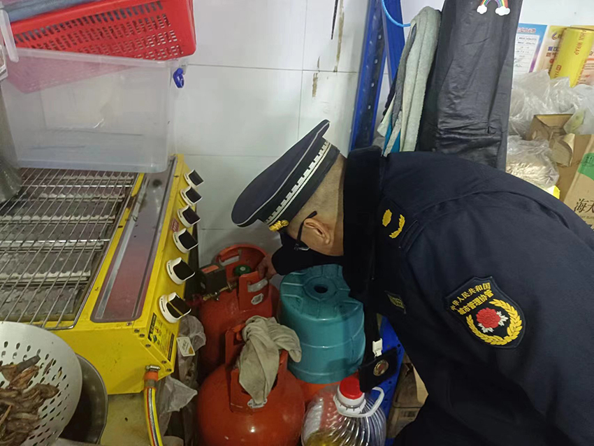 检查中,执法人员对受检餐饮门面是否存在违规用气、燃气使用器材(钢瓶、炉具)是否合格、输气胶管是否老化腐蚀等隐患点位逐一进行了排查。对发现的问题,执法人员也都记录在册,要求当事店面立即整改。