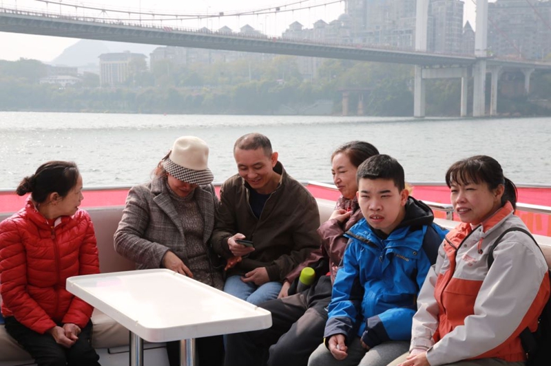 最后带领残疾人乘船畅游在柳江的怀抱里,迎着阵阵江风,赏美景、聊家常、尝美食,其乐融融。远处的山、近处的水、周围的桥梁交相辉映,仿佛进入了“人融于景,景中有人”的优美画卷之中。