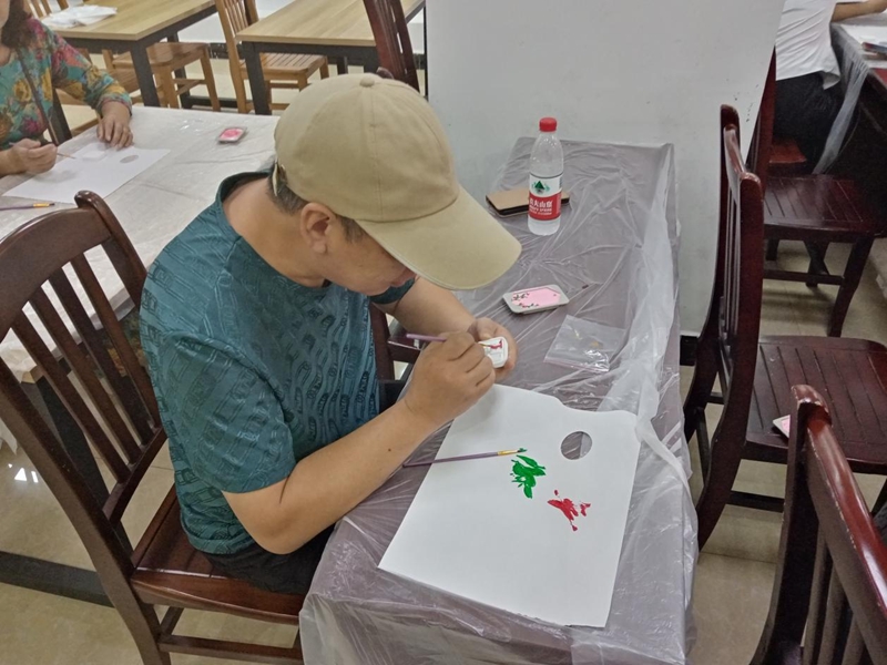 接下来由手工老师教授手工香薰挂件制作。把石膏粉加适量的水搅拌,上色,倒入模具等待凝结。随后老师给现场的残疾人及亲友发放预制好的空白小挂件,用笔和颜料来描字和描边,老师给小挂件嵌上挂钩再交给他们穿上红绳和流苏制作成品。等之前的石膏凝结好脱模就得到一个挂牌,有些手巧的人还在挂牌上画上装饰图案,再穿上红绳。最后选一款心仪的香薰精油喷到两个石膏挂件上,做成手工香薰挂件。参与制作的残疾人及亲友拿着香薰挂件,感谢社区和残联对他们的关心,手工艺品的学习和制作让他们感受到平等,香薰怡人的气息很适合他们日常生活中放松精神、治愈心灵。
