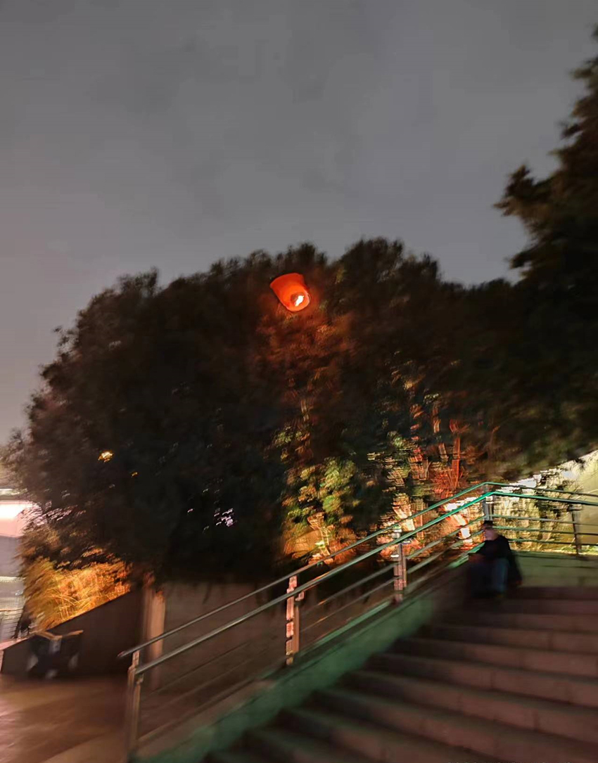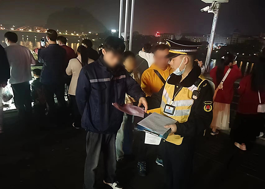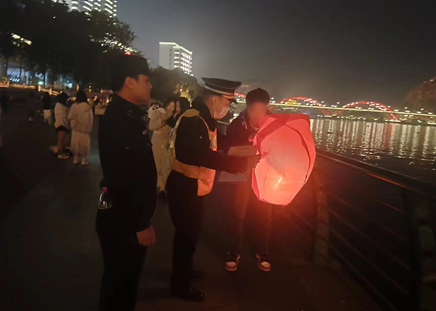 当晚,城管部门联合公安民警在沿线巡查,整治占道经营,维护市容环境。晚8点左右,执法人员巡至柳江大桥桥底附近,正好看到前方一对小情侣刚放飞的一盏“孔明灯”挂到了树上,并引发火情,执法人员迅速采取行动,借来环卫人员的竹扫帚将“孔明灯”扫落,并扑灭树叶火势,保障市民安全。