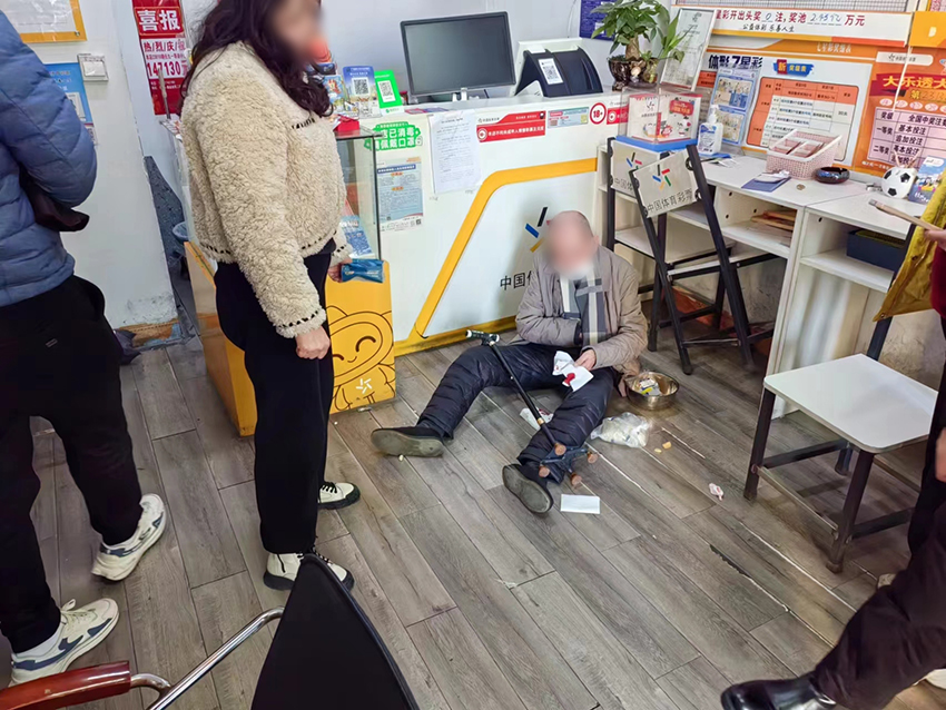 听闻有人受伤,城管队员没有犹豫,立即跟着求助女士进店帮忙。在店里,城管队员看到一名老翁左手流血,背靠桌腿跌坐在地。经沟通得知,老人是因填好彩票号码后起身动作太快,失去平衡摔倒,除手指刮到椅子的铁质靠背受伤流血外,身体没有感到其它不适。城管队员帮老人包扎好伤口后,小心扶起坐到凳子上,并帮他拨打了120。在等待医护人员期间,城管队员按照老人提供的电话,联系到了他的家属。