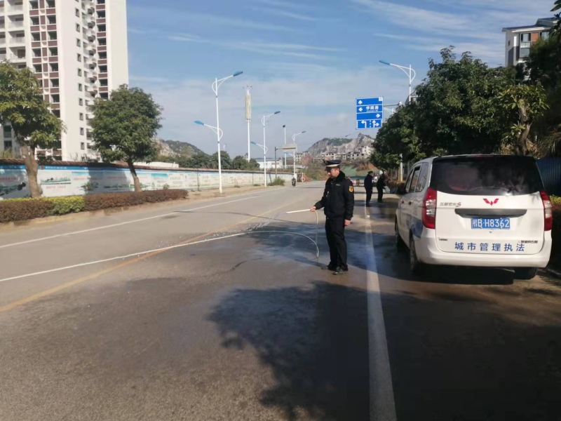 (城中区城管执法局讯 通讯员邓湖广)16日下午,天气放晴,静兰片区的顺畅路的路面上,却出现了一道道的黄泥印子。星星点点的黄泥在过往车辆的碾压下,不时扬起灰尘。由于一时找不到撒漏车辆,前来处置的城管人员化身“洗地工”,从附近接来水管,将黄泥冲洗干净。