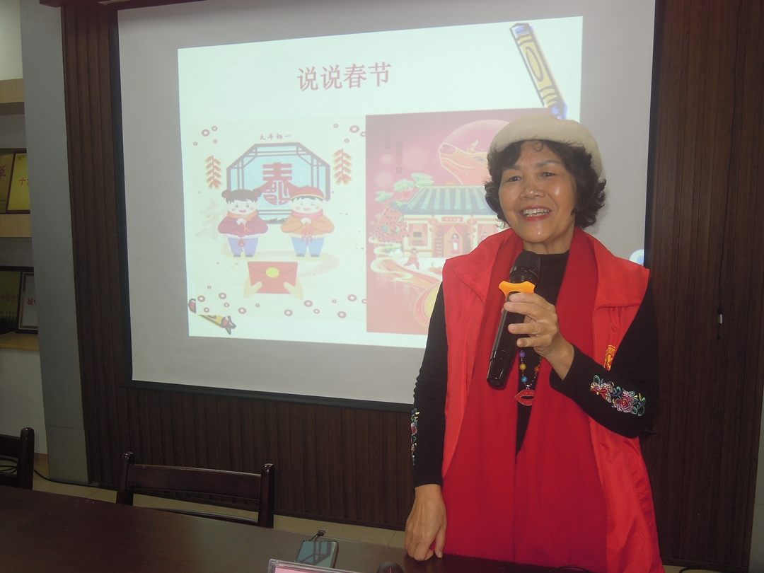 社区邀请区关工委五老宣讲员郑永清为辖区20多名青少年宣讲“春节的故事”。春节是我国最隆重、最热闹的节日之一,凝聚着中华文明的历史文化精华,人们会举行舞狮、放爆竹、拜年、赏花灯、猜灯谜、闹元宵等庆祝活动。希望同学们弘扬中华优秀传统美德,移风易俗,树立文明新风,过一个欢乐祥和的春节。宣讲活动老少互动手语舞“新年好”,祝贺大家春节快乐,还进行春节民俗知识有奖抢答。