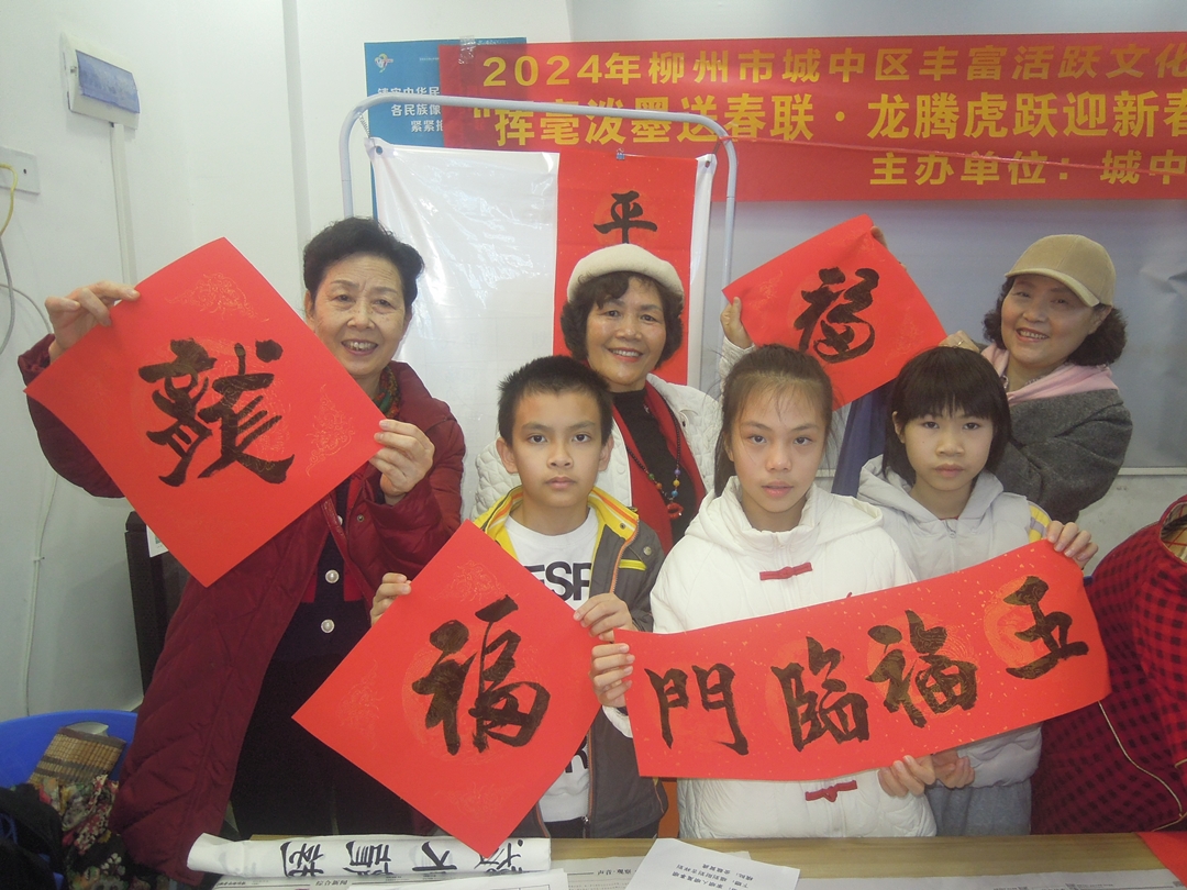 在社区活动大厅,城中区五老和社区书法爱好者饱蘸浓墨、提笔挥毫,楷书、草书等书法字体不同呈现,随着笔锋或抑或扬,寓意吉祥、有着浓浓龙年味的春联、福字呈现在面前。也有青少年尝试自己书写春联,在五老“书法家”的指导下,现场挥泼,共同感受新春的欢喜与愉悦。领到心仪春联、福字的居民群众、新业态新就业群体,脸上洋溢着笑容,活动共计送出春联、“福”字120余副(个)。