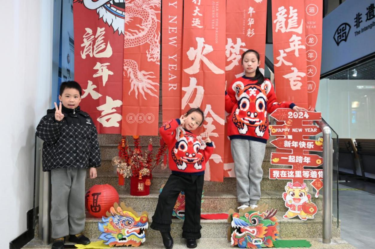 在二楼各功能室内,城中区文化馆“非遗小螺号”志愿者们带领大家体验纸拉龙、国潮龙头帽、龙背包、绒花小飞龙手工制作;书画室里,国学老师教授大家用不同的字体书写“福”字与繁体的“龙”字,感受中国年的喜庆氛围。除此之外,馆内还准备了“科目三”舞蹈教学、新春游园会、欣赏非遗传承人展示石雕技艺、文旅讲堂讲述“龙生九子”的故事、新春电影观赏、沉浸式新春氛围拍照打卡等丰富多彩的活动环节,现场就是一片欢乐的海洋。