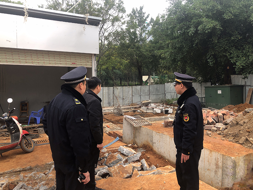 接报后,执法人员前往学院路延长线对投诉进行处置。在现场,执法人员看到工地里施工人员正在挖土砌墙,切割石材,现场灰尘滚滚,随风四散。执法人员对施工人员进行了严肃的批评,工地方接受了意见,立即进行整改,安排工人洒水降尘。