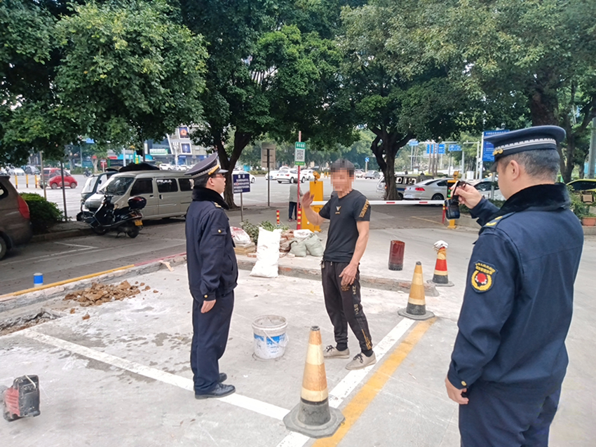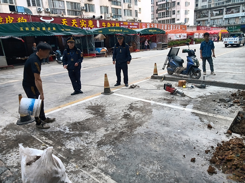 无独有偶,当天桂中大道一停车场也因切割水泥地面被市民投诉施工扬尘。执法人员现场调查后当即叫停了施工人员的施工,向他们宣讲了相关法律法规。要求立即整改,采取洒水措施降尘。随后,施工人员立即进行了整改,派员用水管洒水降尘,清扫尘土。