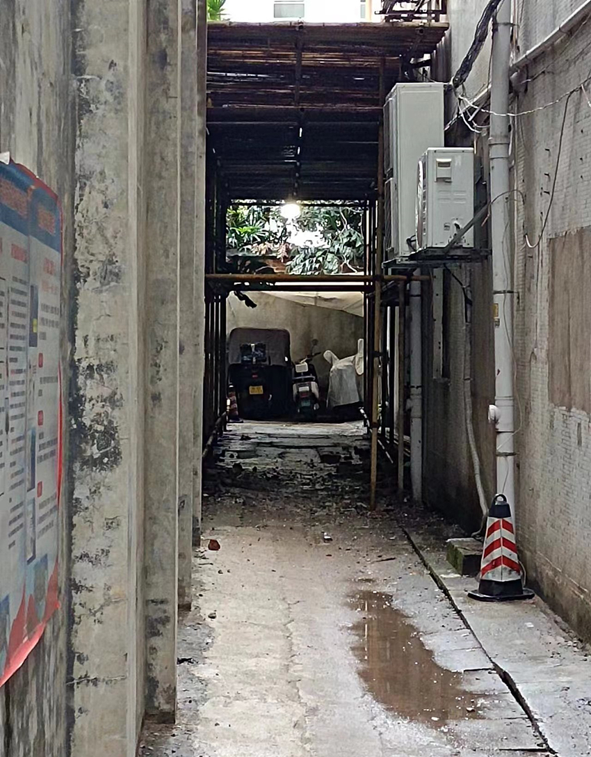城中区城管执法局接报后,迅速派员前往处置。在现场,执法人员看到该处居民反映的通道地面撒落的碎石。碎石撒落位置的顶部铺有竹板,显然是该处有施工项目。