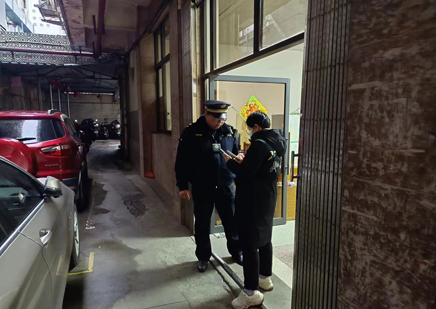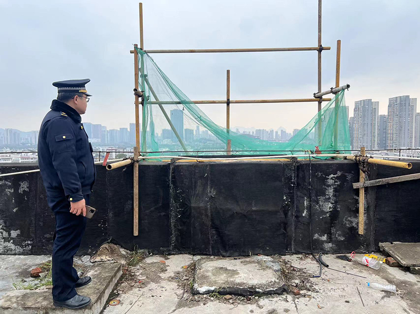 执法人员找到楼顶,看到楼顶堆着一些建筑材料,搭有施工脚手架,覆盖有防尘网,但没见到施工人员。执法人员拍照取证后找到施工管理方的负责人说明来意,并询问了解相关情况。该负责人表示,他们单位在做楼顶维修施工,也按施工要求做了相应防护,但因为设置在楼底巷子顶部的防护竹板面积和密度不够,导致施工中一些碎石穿过防护竹板的缝隙掉落或是掉在竹板上反弹到落巷子里。