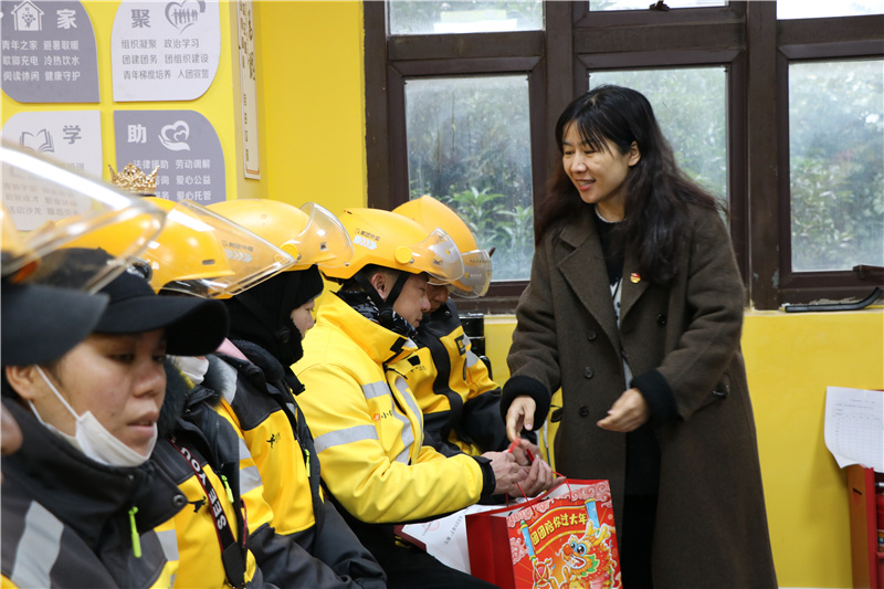 团柳州市委党支部专职副书记王婷婷为青年骑手送上新春祝福
