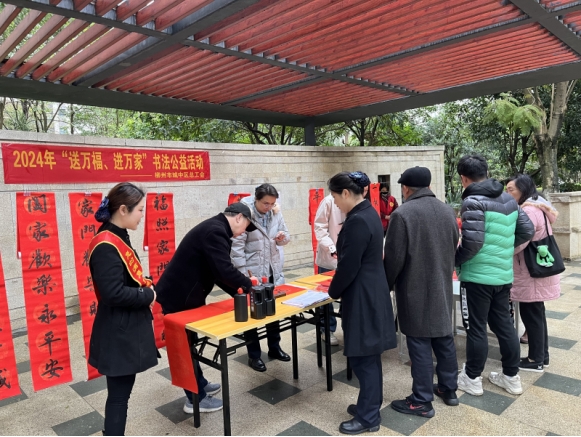 (城中区总工会讯 通讯员刘星辰报道、摄影)寒冬送暖,初岁迎春。为深入学习宣传贯彻党的二十大精神和中国工会十八大精神,弘扬中华优秀传统文化,丰富职工群众精神文化生活,营造欢乐吉祥的节日氛围,1月31日-2月4日,柳州市城中区总工会联合街道社区工会开展2024年“送万福·进万家”书法公益活动,组织书法家进社区为广大职工群众和社区居民免费写春联、“送万福”。