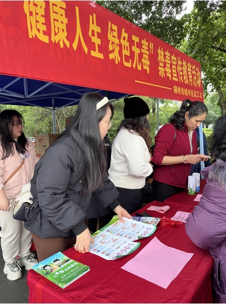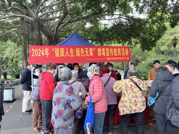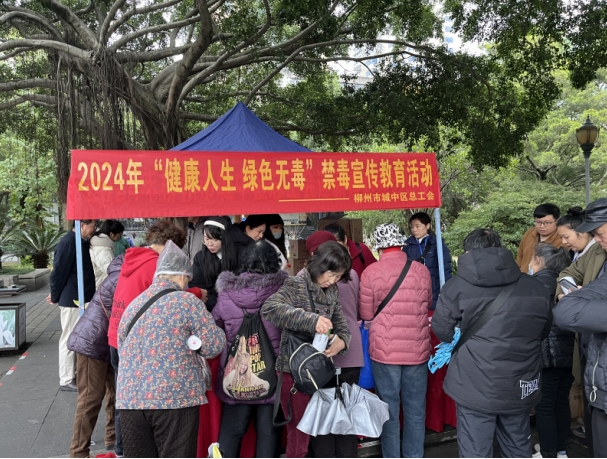 (城中区总工会讯 通讯员刘星辰报道、摄影)玉兔回眸辞旧岁、祥龙献瑞迎新春。为切实做好春节期间禁毒宣传教育,增强广大职工拒毒、防毒能力,2月3日,在春节来临之际,柳州市城中区总工会充分利用春节人员流动大、外出务工人员返乡回家的良好契机,在人民广场开展融合程度高、针对性强、实际效果好的“健康人生 绿色无毒”禁毒宣传教育活动,进一步营造禁毒宣传的浓厚氛围,整体推动禁毒宣传教育全覆盖。