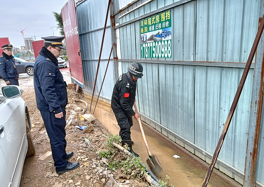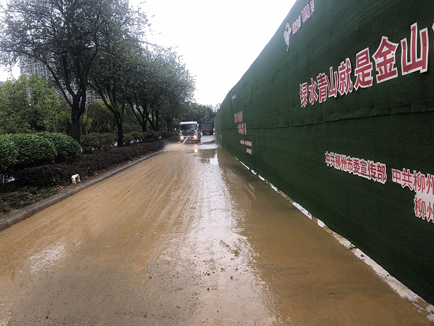 接报后,城管执法人员迅速前往处置。在现场,执法人员看到,该处的非机动车道路面一片泥泞,污水从附近工地的围挡下流出,淤积在路面的低洼处。工地大门不时有车辆驶出,车轮碾过被污染的路面,将黄泥带向更远处,污染了更多的路面。