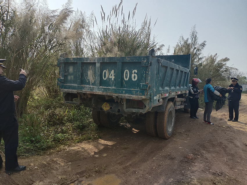 在现场,执法人员看到一辆农用自卸小货车停在路边,车旁站着两名民警和几个村民。其中一名村民告诉执法人员,当天下午,他发现一辆农用车在此倾倒建筑垃圾,压住了自家种的竹丛,当即带人拦住了肇事车辆。然而车主却不愿沟通,而是将车一锁就离开了现场,于是他便拨打了报警和投诉电话。