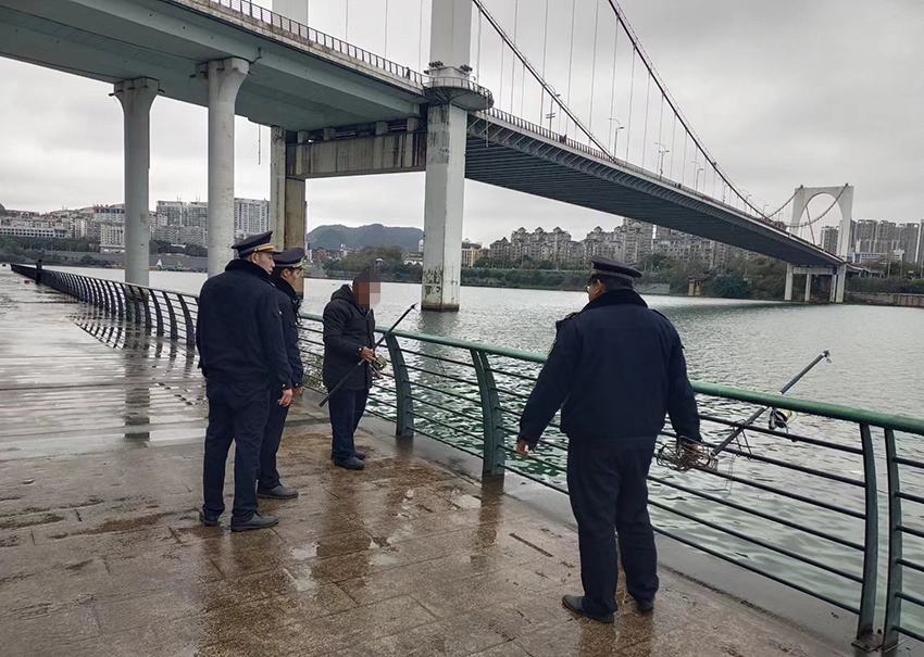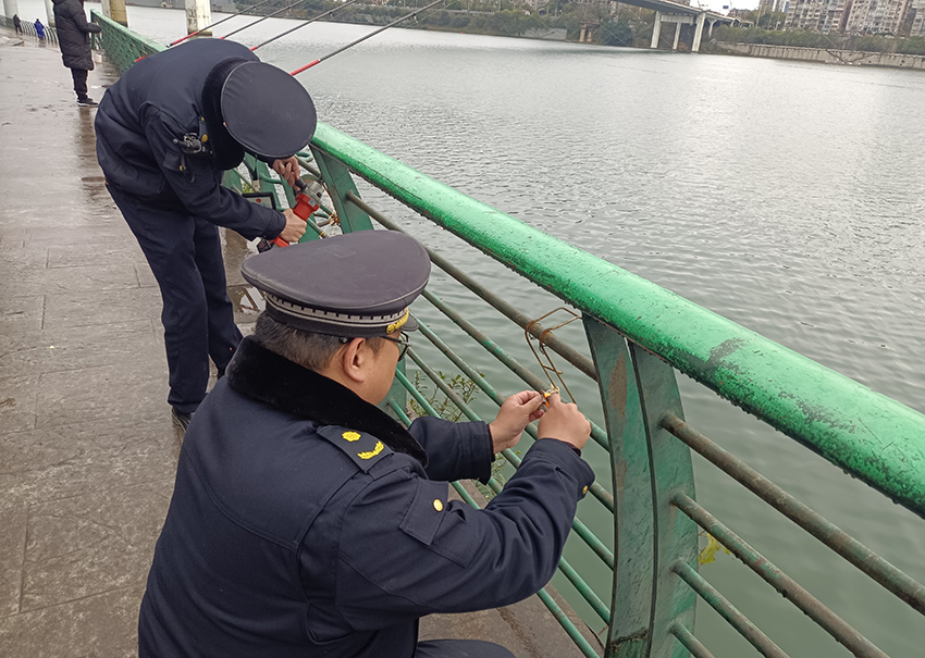 (城中区执法局讯 通讯员邓湖广报道)沿江亲水步道的护栏上,被垂钓者为固定钓竿而安装了铁丝支架,如“暗器”一般,给过往的市民带来隐患。2月5日,接到市民投诉后,城中区城管执法局派员对这些铁线架进行了拆除。
