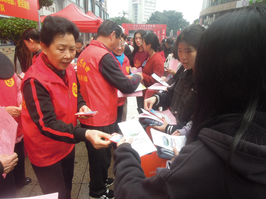 五老志愿者还向同学们和过往群众赠送200多份雷锋为人民服务小故事、社会主义核心价值观、创建文明城和普法、禁毒等宣传小册子。