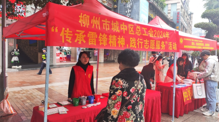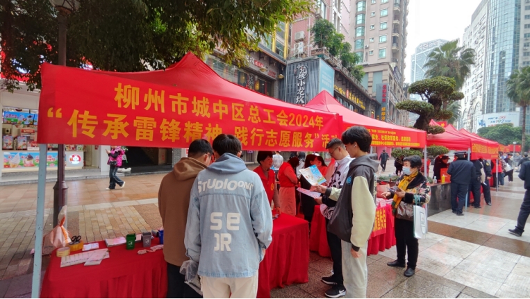 (城中区总工会讯 通讯员刘星辰、吴逸萍报道、覃永泉摄影)今年是第61个学雷锋纪念日,为大力弘扬和传承新时代雷锋精神,用实际行动诠释向善向上的力量,3月4日-3月5日,城中区总工会联合社区组织了辖区各企业单位的职工开展了“传承雷锋精神,践行志愿服务”活动。