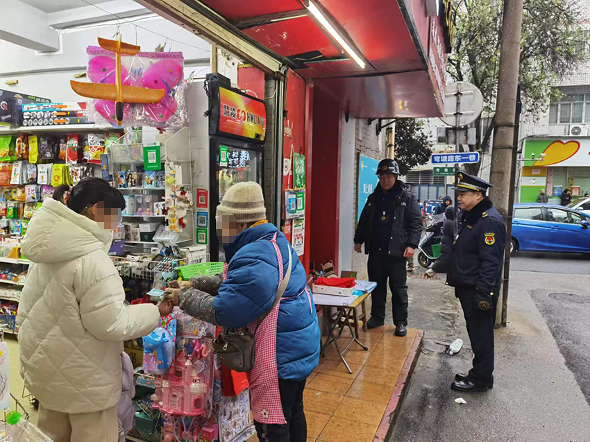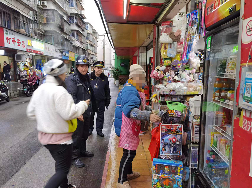 早晨7点30分左右,弯塘路小学周边挤满了背着书包的学生和送学家长。在此执勤的城管队员看到弯塘路东一巷巷口处的一家餐饮店将物品摆到了店外人行道上,影响了行人通行。当即上前对店主进行劝阻,要求她将占道物收回店里,给学生家长让出道路。
