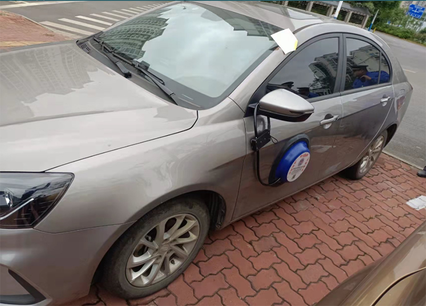 2023年4月24日,城中区城管执法局的执法人员在巡查时,发现土伏路与土伏南路交汇处人行道上违法停放着一辆灰色小汽车,执法人员取证完毕后,贴上了电子告知单。