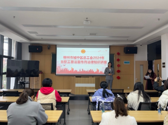(城中区总工会讯 通讯员邹诗薇报道、刘星辰摄影)为深入学习宣传贯彻习近平法治思想,学习宣传贯彻中国工会十八大精神,推动男女平等基本国策贯彻落实,大力营造全面维护女职工权益的良好氛围,根据全国总工会女职工部、法律工作部、自治区总工会通知精神,城中区总工会于3月20日上午在城中区文化馆开展2024年女职工普法宣传月法律知识讲座。来自城中区机关、企事业单位女职工共60余人参加。
