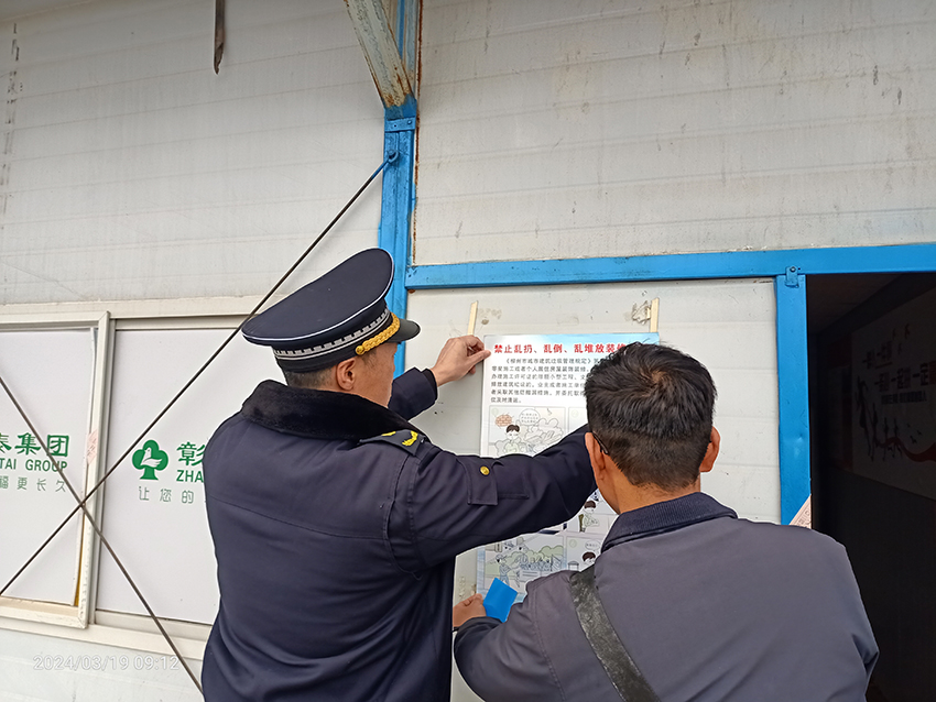 随后,执法人员和工地人员一起将宣传海报张贴到在工地的进出口和办公区域,并对工地的围挡设置、降尘设施和进出路口硬化、自动冲洗设施是否正常使用等情况进行了实地检查。同时,也提醒工地要做好施工区域的裸土全覆盖和施工中的抑尘措施。