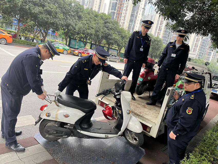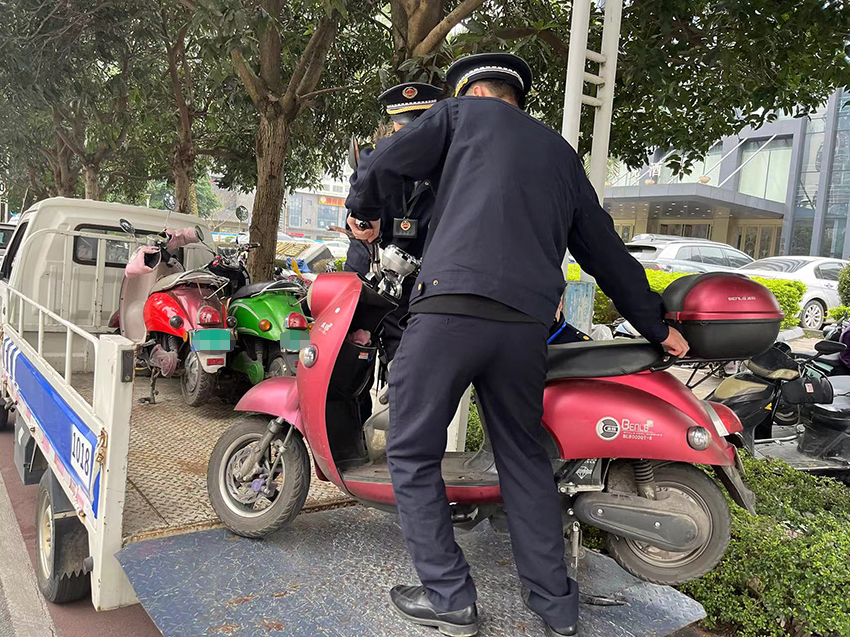 当天的行动中,执法人员对晨华路、高新南路、体育路等多条路段的公租单车存取点进行了巡查整治,共有8辆违停的电动车被依法拖离。