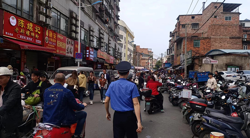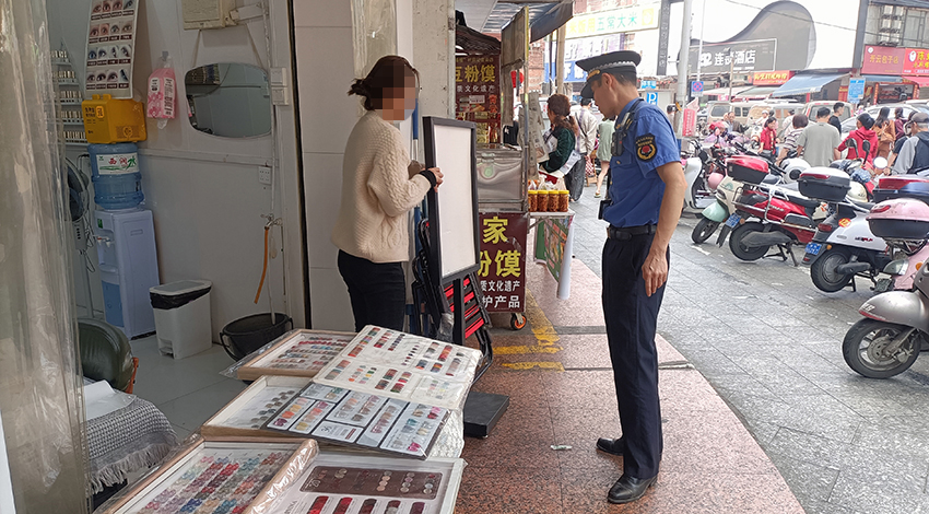 青云路各类餐饮店面云集,许多店面都是生意火爆的“网红店”,也是执法人员需要重点“照顾”的路段。当天的巡查中,执法人员发现一些店铺为了让更加亮眼“吸睛”或是招揽顾客,将经营工具或是招牌广告放到人行道上,店门口也丢弃有纸巾塑料袋等垃圾等现象,都当即向当事店面指出问题,责令立即进行整改。“马上‘三月三’了,你们都是‘网红店’,搞干净点对你们自己的生意也更好呀。”执法中,执法人员采用“拉家常”式的方式,督促当事业主做好“门前三包”工作,以干净整洁有序的“颜值”,迎接八方来客。