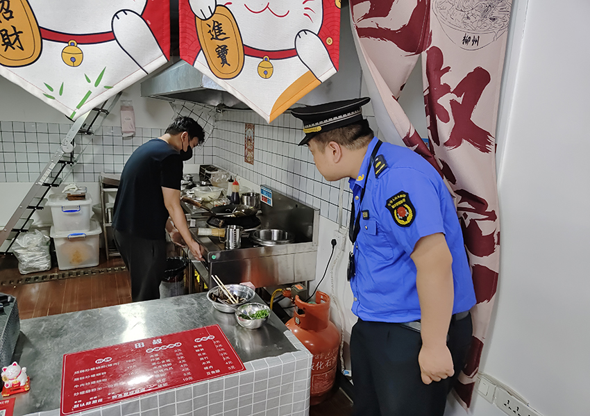 此外,为了广大游客打造一个安全放心的用餐环境,执法人员对辖区内餐饮店面的燃气使用安全进行了排查整治。登门“拜访”了近百家餐饮门面,对店内是否存在违规用气、燃气使用器材(钢瓶、炉具)是否合格、输气胶管是否老化腐蚀等隐患点位逐一进行了排查。发放了200多份燃气安全知识、餐厨垃圾规范收运及垃圾分类相关的宣传资料,提高商家的安全意识。