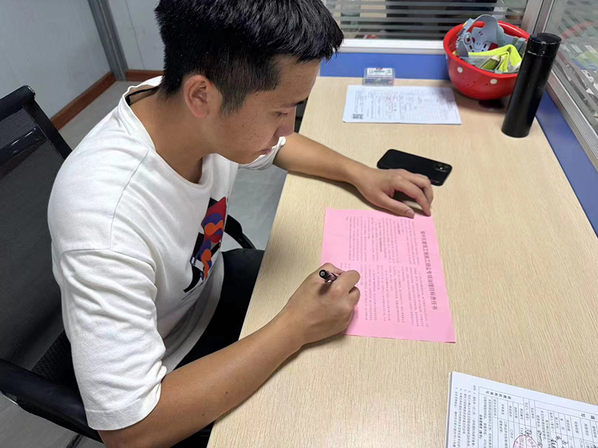 按照边宣传便签订的工作模式,队员在签订现场与施工方耐心细致讲解责任书的相关内容及要求,进一步明确施工单位的管理范围、管理标准,强化了施工单位的责任意识。要求工地严格按照施工工地周边100%围挡、物料堆放100%覆盖、施工现场100%湿法作业、出入口100%硬化、出入车辆100%冲洗、渣土车辆100%密闭运输“六个百分百”的标准做好扬尘治理措施,力争从源头上遏制扬尘污染。