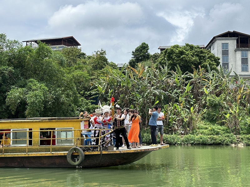 同样精彩的还有古渡遗风码头,游客与身穿节日盛装的演员们一边唱着山歌,一边游览柳江美景,陶醉于“大美环江”的迷人风光里。