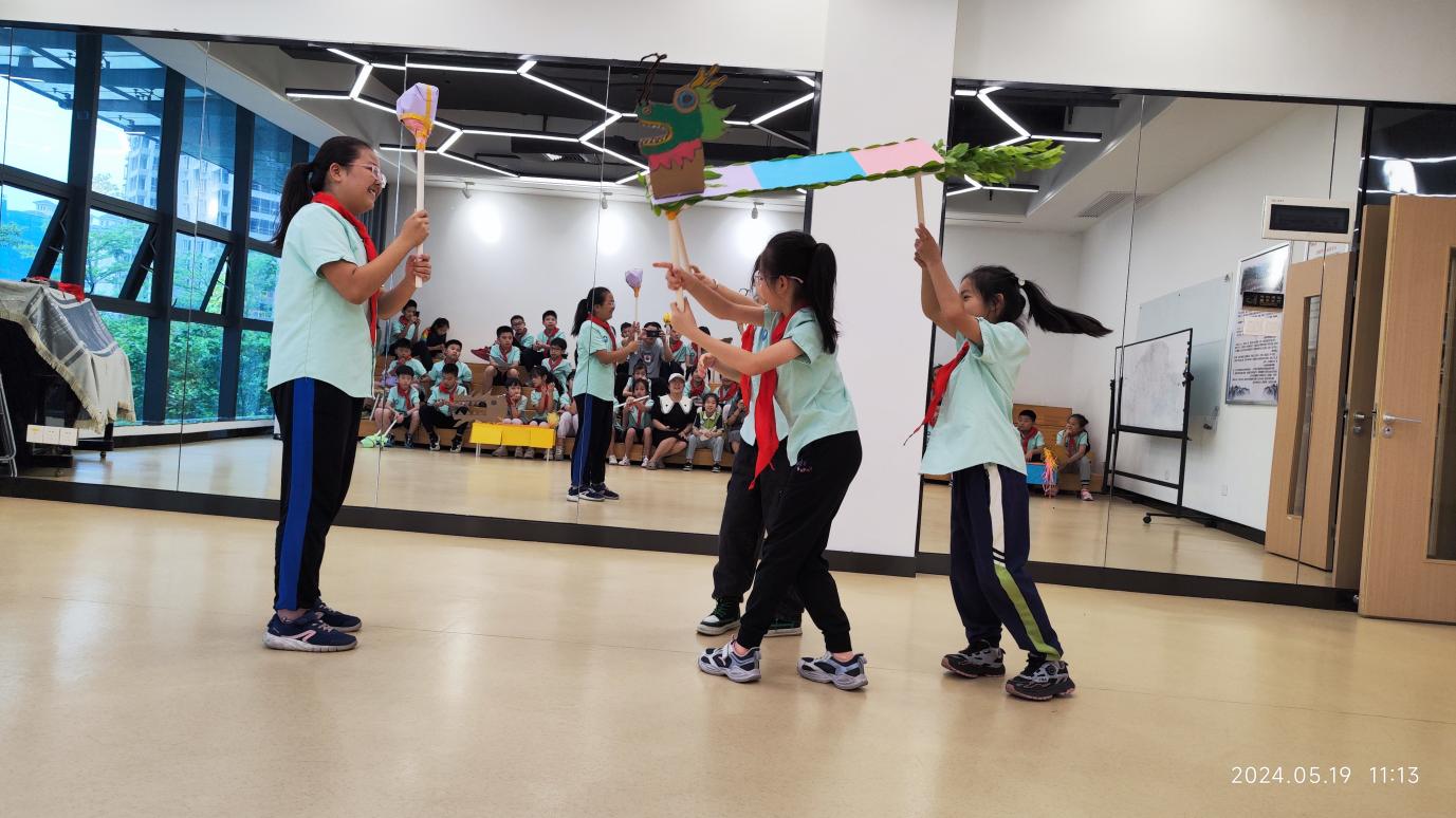 对该项传统舞蹈有了初步的了解后,同学们分组抽取物料包盲盒开始研学任务。各小组激情讨论,大家团结协作,有的负责板凳龙制作,有的根据所分配到的背景音乐进行“板凳龙舞”动作的创编,一个小时后,各小组纷纷展示了精彩的“板凳龙舞”表演。面对今天这新奇又富有挑战的研学任务,大家都倍感开心、收获满满。最后,同学们纷纷与自己制作的“板凳龙”合影留念。文韬小学带班侯老师说道:天又雨,意未犹。龙城的孩子,讲龙的故事,做板凳龙,舞板凳龙,是2024年值得纪念的事。