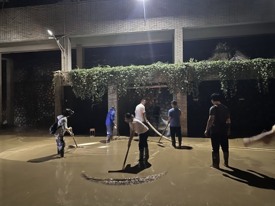 谭晓剑同志说:“水退人进,随时出击。因为今年的水位比较高,八十六点多,按照往年的清淤经验,要在洪水逐渐退去的第一时间清扫淤泥。”“同志们、开干啦!”随着谭晓剑同志从清淤点视察发回的消息,大伙拿着扫帚、铁铲、刮板、高压水枪等各式清淤“武器”齐上阵。洪水退去后,清淤点楼道间,屋内、车库里积满了淤泥和杂物,留下了厚厚的淤泥和油桶、铁板、瓶瓶罐罐等垃圾。谭晓剑同志带领男同志冲锋在前,扛起最重的水枪头,其他同志紧跟其后,巾帼不让须眉,拿起铁铲,将厚实的淤泥推出院子,推进河里。此时,天已渐渐变黑,月亮已上枝头,匆匆解决晚饭后,大伙头戴头灯,继续奋战,借着岸边路灯,迎着月色,发扬不怕脏、不怕苦、不怕累的精神,继续扛着高压水枪把厚厚的淤泥冲散,用铁铲把松动的淤泥往江边推,大家满身淤泥,汗水已然湿透全身,没有一人叫苦喊累。直到深夜12点,经过一晚上的辛勤劳动,终于将受淹的淤泥清除干净,大家拖着疲惫的身体逐渐散去。