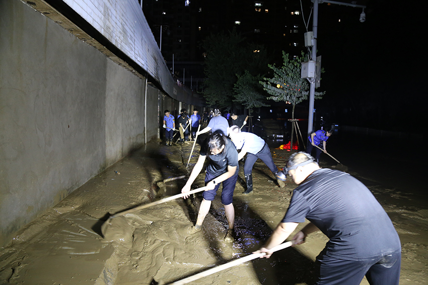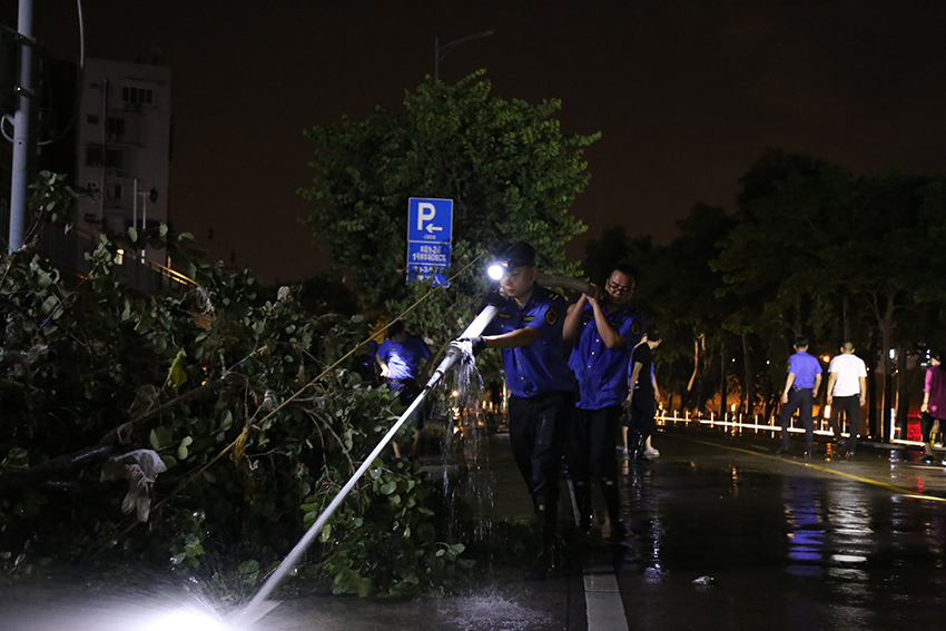 当日上午,清淤行动首先金沙角观景平台打响。城管队员们扫帚、铁铲、刮板、水枪各式“武器”一起上阵,顺洪水退却的路面,将平台上的淤泥杂物一一清扫干净。