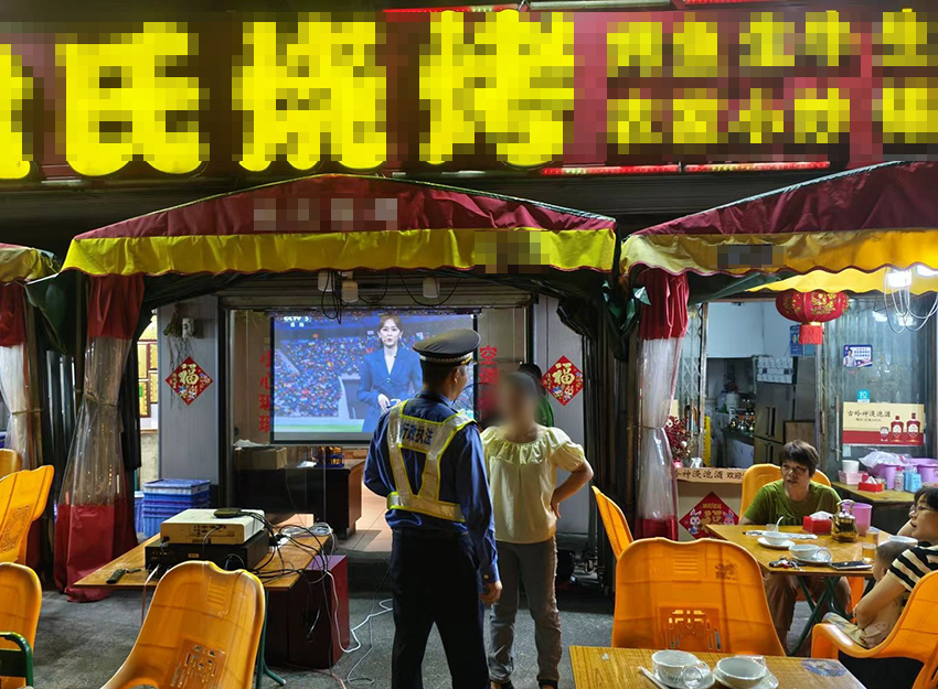 在现场执法人员看到,一家烧烤店门前安装了一台电视,几桌食客围桌而坐,边喝酒边看球,兴奋的大声喝彩,环境一片嘈杂。执法人员对店主进行了批评教育,要求他调低电视音量,并在超过规定营业时间后关闭电视。同时,执法人员在夜市里展开了宣传,对喧闹的食客进行劝阻、提醒,发放“静音助力中考”《倡议书》,引导他们文明用餐,自觉控制和抵制噪音。