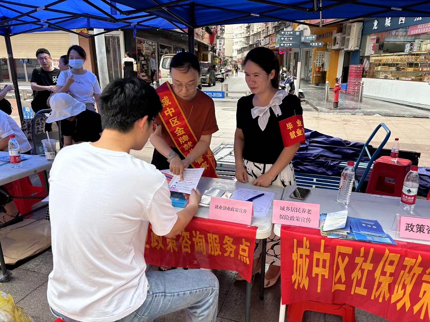 (城中区人社部门工作人员向求职者发放宣传资料)