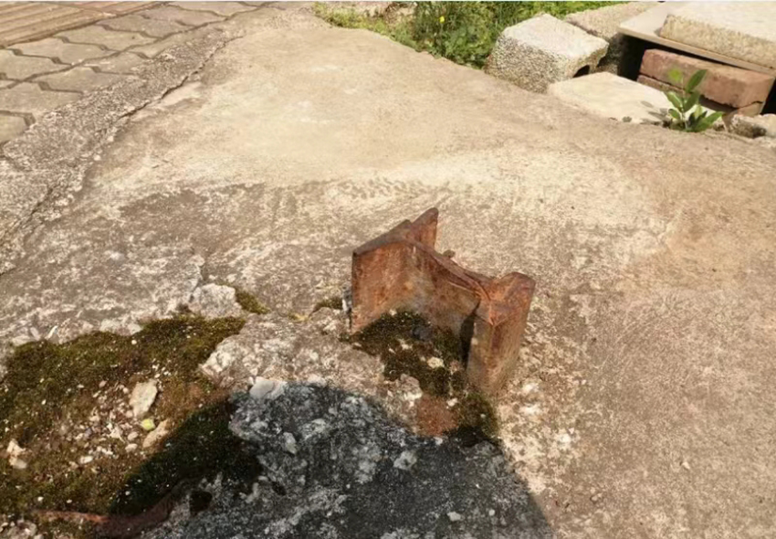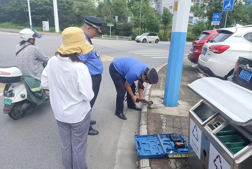 无独有偶,当天,在柳美路的人行道上也有一个角钢地钉被市民投诉。因为也是无法到责任单位,执法人员自己动手将地钉拔除。