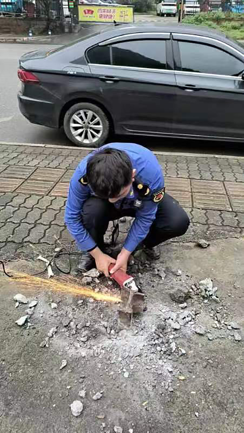 近日,三门江社区城管工作站接到社区工作人员反映称,春风路人行道上残留有地钉,对过往行人造成脚下安全隐患。执法队员赶到现场查看,发现该处人行道的一根路灯杆处有一截高出地面约2厘米的角钢。为了防止这根地钉“伤人”,城管队员随即用切割机将角钢管齐地割断磨平,恢复道路原貌。