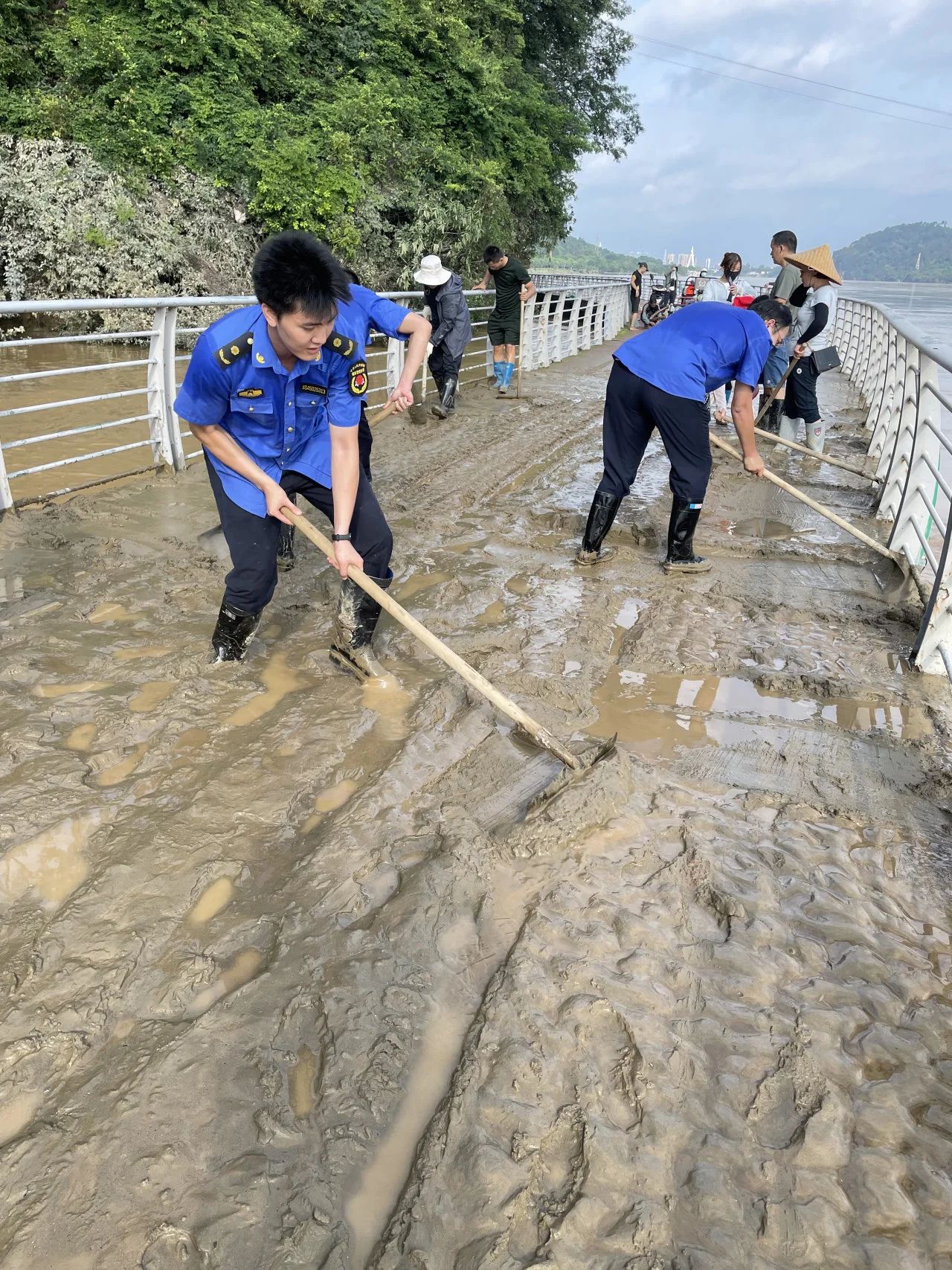 上午6时,200多名执法人员按计划在滨江东路、环江滨水大道等清淤点集结,开展清淤。