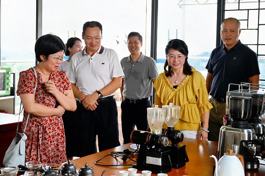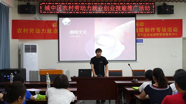 (柳州市就业服务中心主任覃春秋、城中区政府党组成员唐宏虎体验咖啡制作)